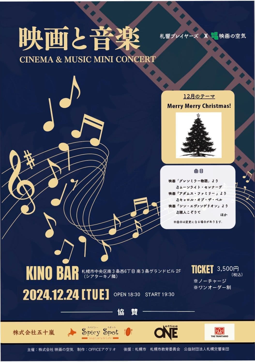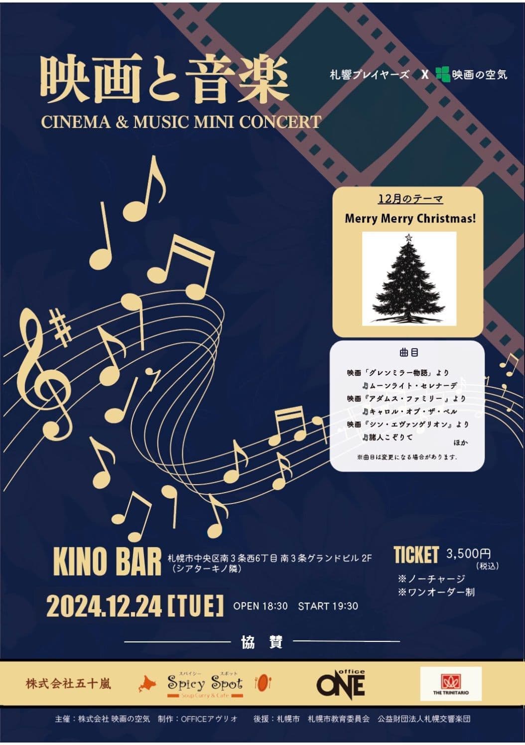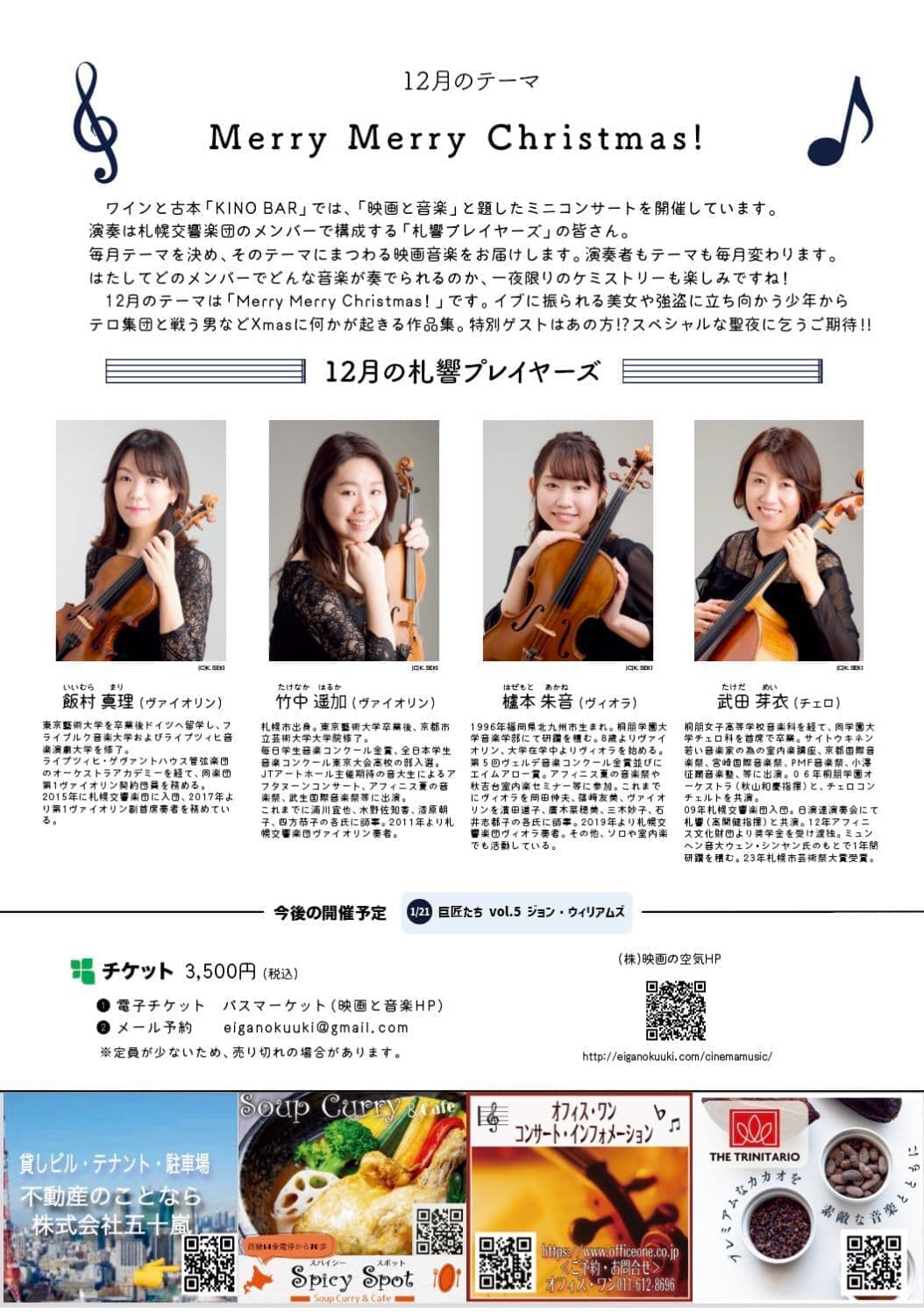 ワインと古本「KINO BAR」では、「映画と音楽」と題したミニコンサートを開催しています。演奏は札幌交響楽団のメンバーで構成する「札響プレイヤーズ」の皆さん。毎月テーマを決め、そのテーマにまつわる映画音楽をお届けします。演奏者もテーマも毎月変わります。はたしてどのメンバーでどんな音楽が奏でられるのか、一夜限りのケミストリーも楽しみですね!