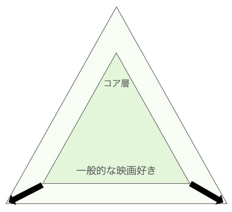 映画好きな方はたくさんいるけど、その深さは人それぞれ違いますよね。一年に1本くらいしか映画を観ない人もいれば、マニアと呼ばれる一年に100本以上もの作品を観る人もいます。日本人の平均鑑賞本数は年間1.2本と言われているので、年間2本観ればあなたはもう映画好きです。そういう方はたくさんいます。一方でマニアの皆さんは数が少ないけど、映画ファンのコア層であって、映画業界をも支える重要な方々。映画ファンをピラミッドに例えるとその頂点にいる数少ない方々です。さらに言えば映画業界で働く皆さんはそのほとんどが映画大好き人間!映画監督をはじめとする映画を制作する皆さん、映画を配給する皆さん、そして映画を上映する皆さんと他にも大勢の方が映画と共に生きています。そのような皆さんもコア層だと思います。