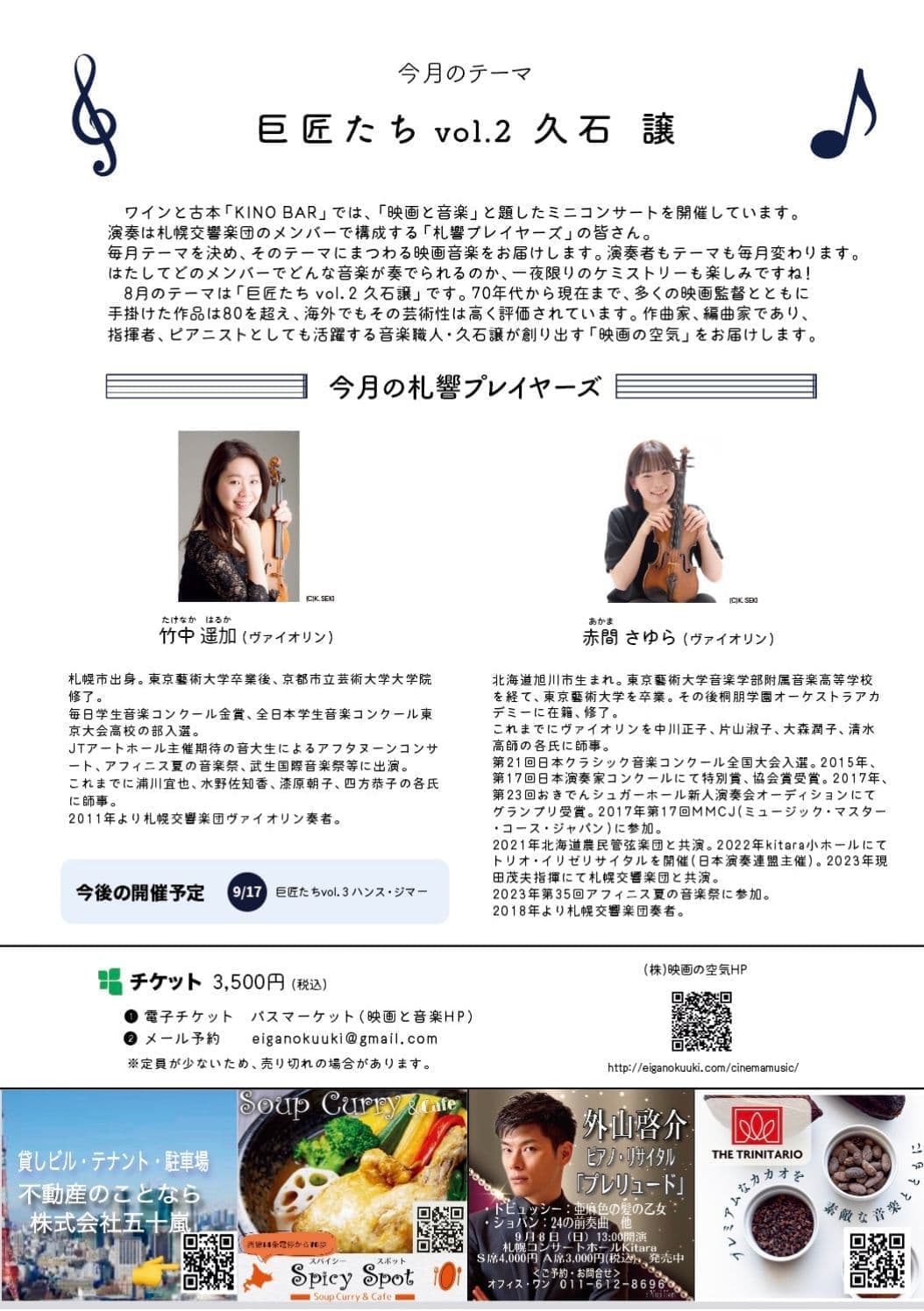 ワインと古本「KINO BAR」では、「映画と音楽」と題したミニコンサートを開催しています。演奏は札幌交響楽団のメンバーで構成する「札響プレイヤーズ」の皆さん。毎月テーマを決め、そのテーマにまつわる映画音楽をお届けします。演奏者もテーマも毎月変わります。はたしてどのメンバーでどんな音楽が奏でられるのか、一夜限りのケミストリーも楽しみですね!