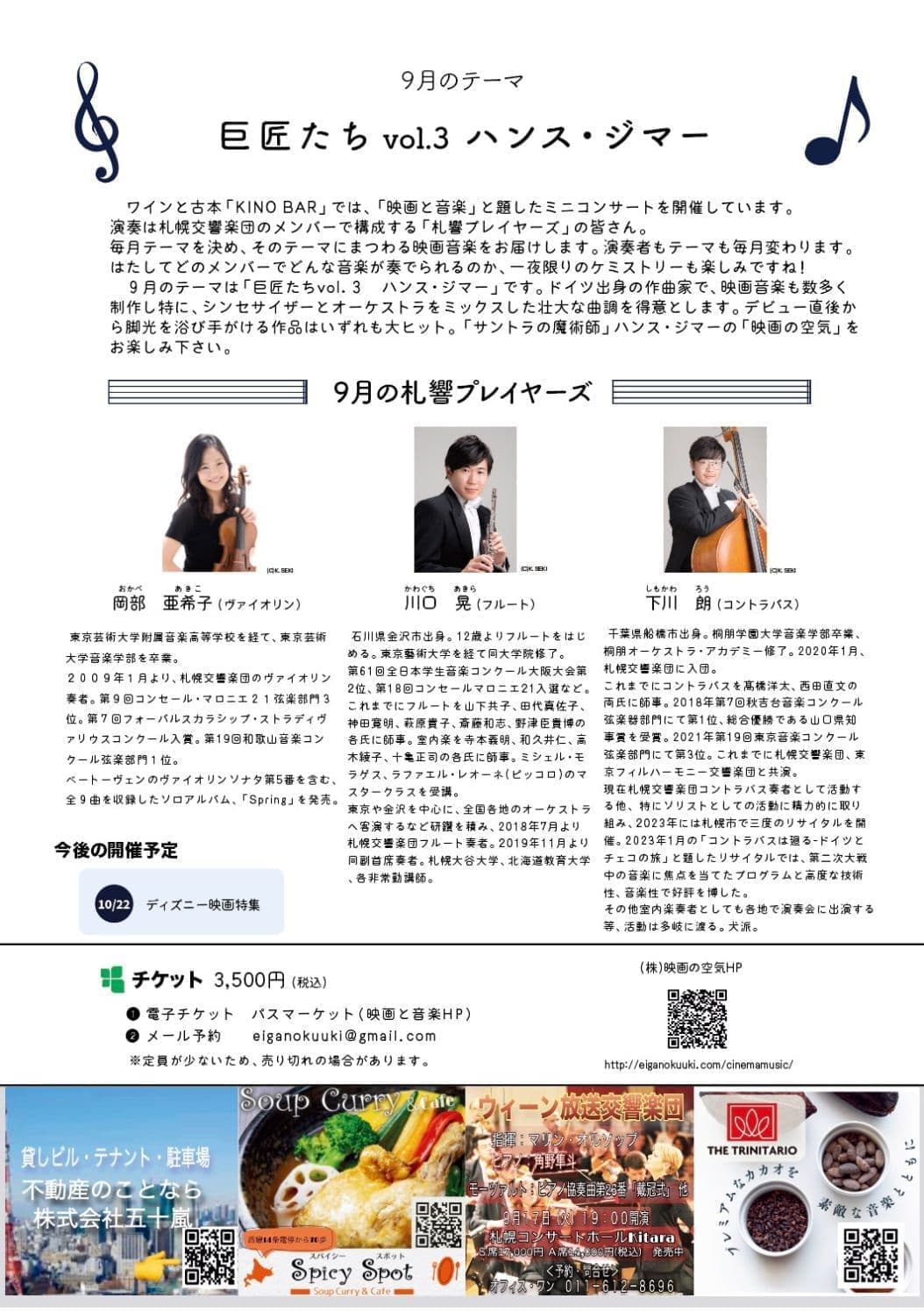 ワインと古本「KINO BAR」では、「映画と音楽」と題したミニコンサートを開催しています。演奏は札幌交響楽団のメンバーで構成する「札響プレイヤーズ」の皆さん。毎月テーマを決め、そのテーマにまつわる映画音楽をお届けします。演奏者もテーマも毎月変わります。はたしてどのメンバーでどんな音楽が奏でられるのか、一夜限りのケミストリーも楽しみですね!